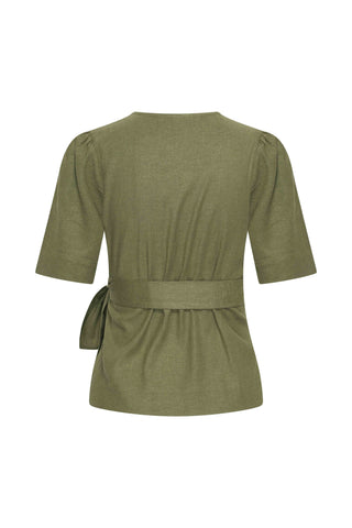 Elegante wikkeltop in army groen van Zilch. De top heeft korte mouwen die net iets langer vallen en een geplooide voorkant die sluit met een strik aan de zijkant, waardoor je silhouet mooi geaccentueerd wordt. De ademende stof en flatterende pasvorm maken dit een ideale keuze voor zomerse dagen. Combineer met de bijpassende wijde broek voor een stijlvolle en comfortabele outfit.